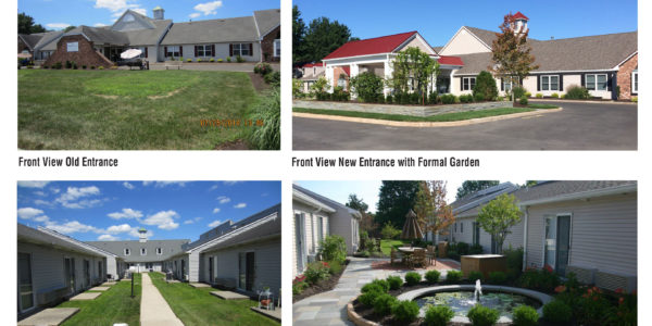 In addition to correcting the code deficiencies, a Memory Care unit was added and the way common spaces were used was reimagined. Straight rows of housing units with a narrow walkway in-between buildings were replaced with a “Town Hall and Main Street” concept. The main building, which housed activities and the library was made one focal point and a new building was constructed at the other end of the square for dining created another focal point both sharing a Town Square for additional activities. Exterior spaces were redesigned and landscaped into seven different areas including shady lanes with water features and numerous places to sit and chat.